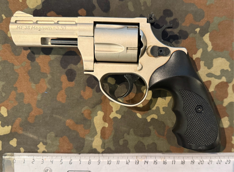 Revolver ME 38 Magnum im Kaliber .22 (5,5 mm) Air. Vernickelt (Stainless Optik). Made in Germany! Kunststoffgriffschalen, F im Fünfeck. Ein schönes Modell eines 3 Zoll Taschenrevolvers. Verstellbare Visierung. Ohne weitere Zubehör. Es werden für die Nutzung 5 Patronen (LEP Hülsen) für Pressluft und eine entsprechende Pumpe zur Befüllung der Patronen benötigt. Der Revolver wird ausdrücklich als Teil eines unvollständigen Sets angeboten!