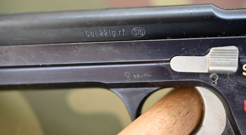 Markenlogo „SIG“ im Oval, Seriennummer "41747" rechts auf dem Schlitten und auf dem Griffstück. Gültige bundesrepublikanische Beschusszeichen "Adler über N" auf Schlitten, Lauf und Griffstück, auf letzterem datiert "68" = 1968. „S“ und „F“ links auf dem Griffstück, Kaliberangabe „Cal. .22 lg.rf.“ linksseitig auf dem Schlitten.