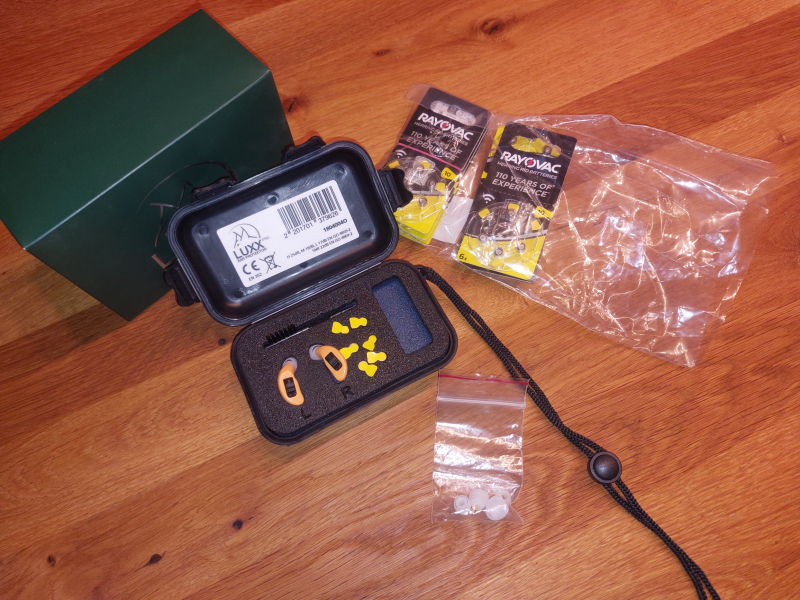 Sie bieten auf einen nahezu unbenutzen, voll funktionsfähigen Luxx Pro "in ear" akustischen Gehörschutz. Der Neupreis lag bei 489 Euro. Ich habe den Gehörschutz einmal genutzt und lag seit dem im Schrank. 90 Batterien gehören zum Lieferumfang. Der Gehörschutz regelt Schussgeräusche effektiv runter und gibt normale Umgebungsgeräusche naturgetreu wieder. Der Lieferumfang besteht wie auf den Bildern ersichtlich aus dem vollständigem Zubehör. Der Artikel kann gerne nach Rücksprache besichtigt und ausprobiert werden. Da es sich um eine Privatauktion handelt, kann ich keinerlei Garantie oder Rücknahme gewähren.