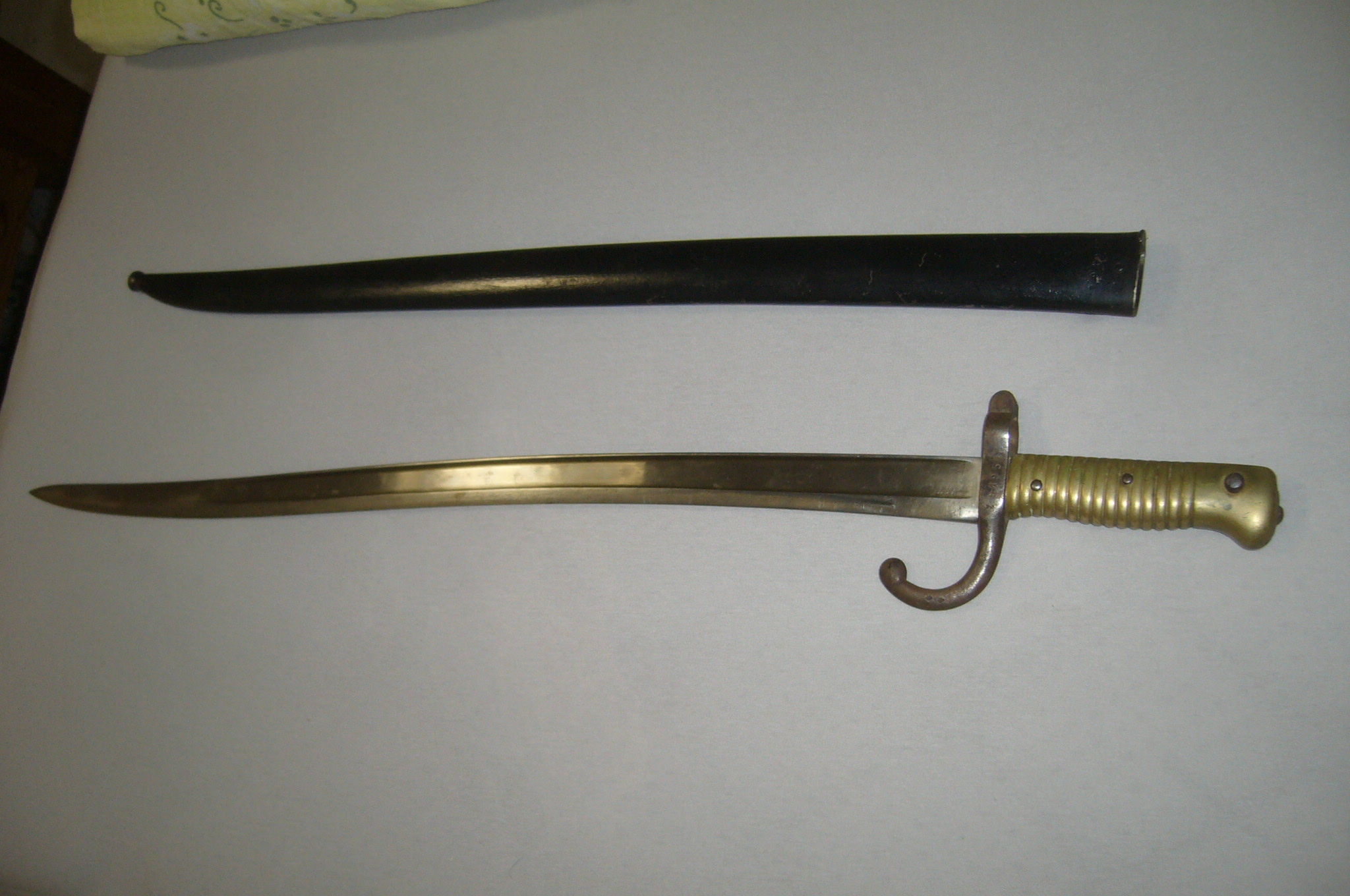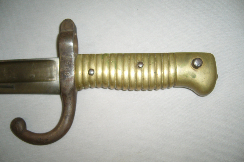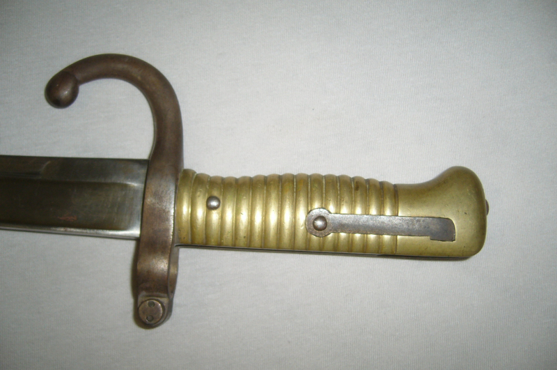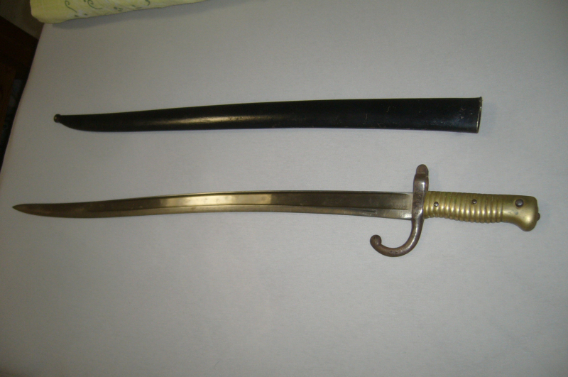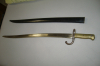 Langes Bajonett Frankreich 1874 mit Scheide Messinggriff, auf dem Klingenrücken steht ein Name und dahinter 1874, drücker Funktioniert, Klingenlänge: 57,8cm, sonst schöner Zustand altersbedigt gut.