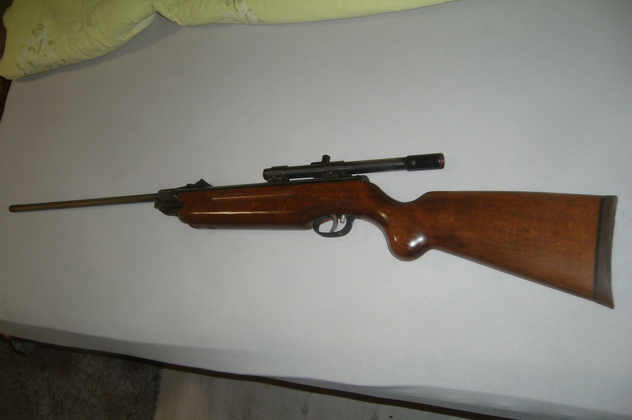 Luftgewehr Weirauch HW 35 F mit WEKU 4 Zielfernrohr, Schaft guter Zustand, Brünierung abgegriffen, ohne Sicherung, Kimme vorhanden, Korn fehlt, leider läßt es sicht mehr spannen vielleicht Feder Defekt.Nummer hinten ist 600091.