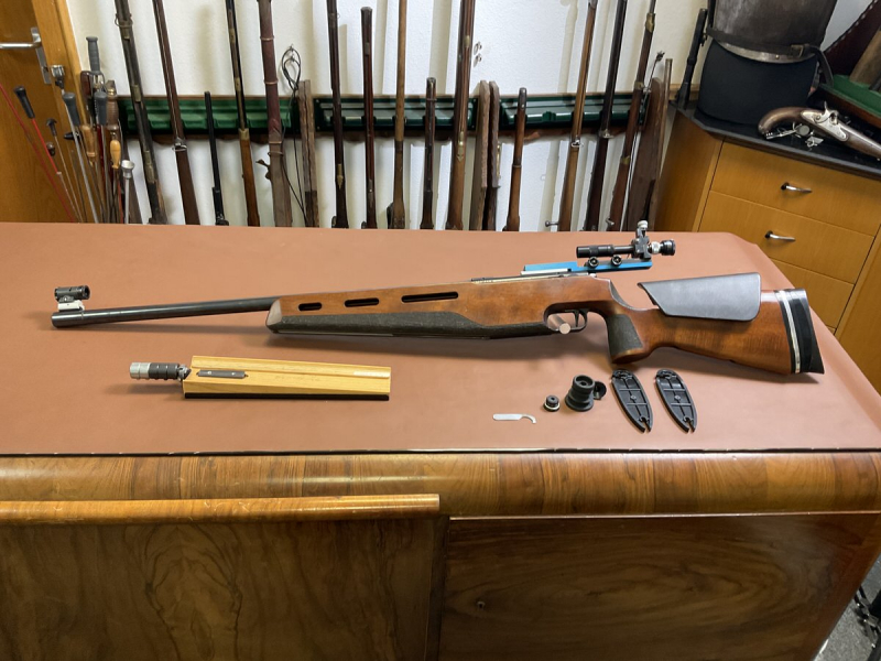 zum Verkauf steht eine Einzelladerbüchse Anschütz Modell 1807. diese Waffe ist eine hochwertige Einzellader-Kleinkaliberbüchse im Kaliber .22 LR, gefertigt für den präzisen sportlichen Schießbetrieb. Das vorliegende Exemplar trägt die Seriennummer 189445 und wurde 1981 in Ulm mit dem Beschusszeichen Adler N beschossen. Die Büchse ist ausgestattet mit einem 0,3-Dioptrin-Adlerauge M18, welches eine besonders feine Zielerfassung ermöglicht. Ergänzend dazu verfügt sie über eine verstellbare Irisblende im Bereich 0,8 bis 2,2 die eine flexible Anpassung an Licht- und Sichtverhältnisse erlaubt. Zusätzlich ist ein verstellbarer Blaufilter am Diopter montiert, der für bessere Kontraste bei bestimmten Lichtbedingungen sorgt. Für das aufgelegte Schießen ist ein Auflegkeil vorhanden, der inklusive einer seitlichen, lösbaren Auflegbacke geliefert wird. Diese ermöglicht eine stabile und anpassbare Auflageposition. Der Gesamtzustand der Büchse wird als gut beschrieben.