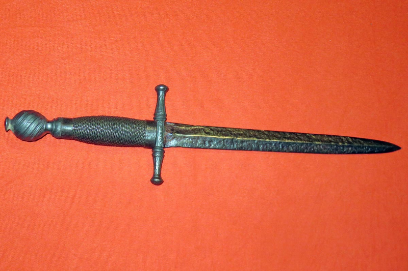 Alter Dolch mit verzierter Eisenparierstange, Knauf, mit Eisendraht umwickeltem Griff und zweischneidiger Klinge.