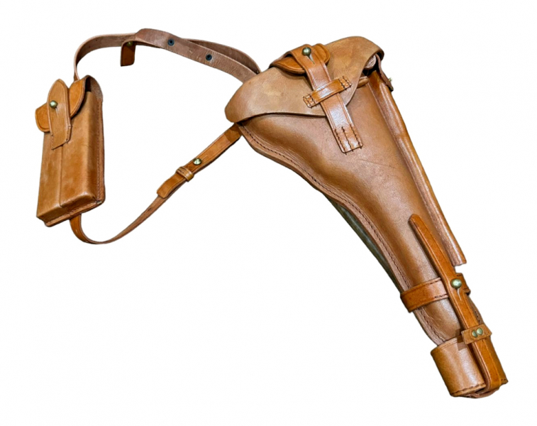 Versorgt wird beides in und hinter dem ledernen Holster, welches noch eine Magazintasche für 2 Magazine an der Beriemung aufgeschlauft hat. Somit kann das komplette Set inclusive lange Artillerie 08 über der Schulter getragen werden.