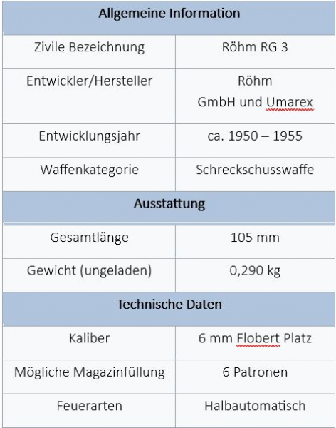 Die Röhm RG3 ist eine Schreckschusspistole im Kaliber 6 mm Flobert, die seit den 1950er Jahren weitgehend unverändert gebaut wird, jedoch in Details modifiziert wurde, beispielsweise durch die Möglichkeit, das Magazin bei aufgeschraubtem Signalbecher zu wechseln.