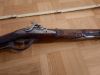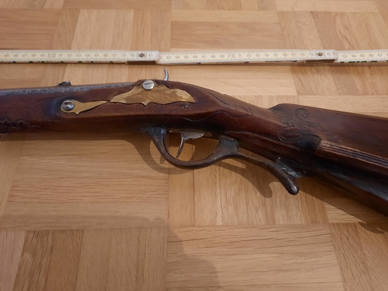 Kurze Vorderlader Perkussionsbüchse. Abmessungen: 96 cm x 19 cm x 9 cm. Zustand siehe Fotos. Abzugsmechanismus nicht funktionsfähig, diverse kleinere Holzausbrüche. Risse, Kratzer, Abschabungen, Druckstellen, Dellen im Holz, Lauf mit Korrosion, Schaft im vorderen Bereich fehlend. Schrauben, Beschläge teilweise nachträglich ersetzt. Korn des Visiers fehlend. Schön geschnitzter Schaft mit schöner Patina. Privatverkauf unter Ausschluss jeglicher Sachmängelhaftung, Gewährleistung und Garantie. Keine Rücknahme.