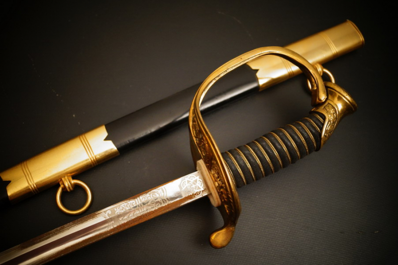 Fundzustand. Lederscheide mit vergoldeten Bronzebeschlagteilen. Gefäß aus Bronze, offen, vergoldet. Klinge mit feiner Ätzung. Ungeputzt und in perfektem Zustand.