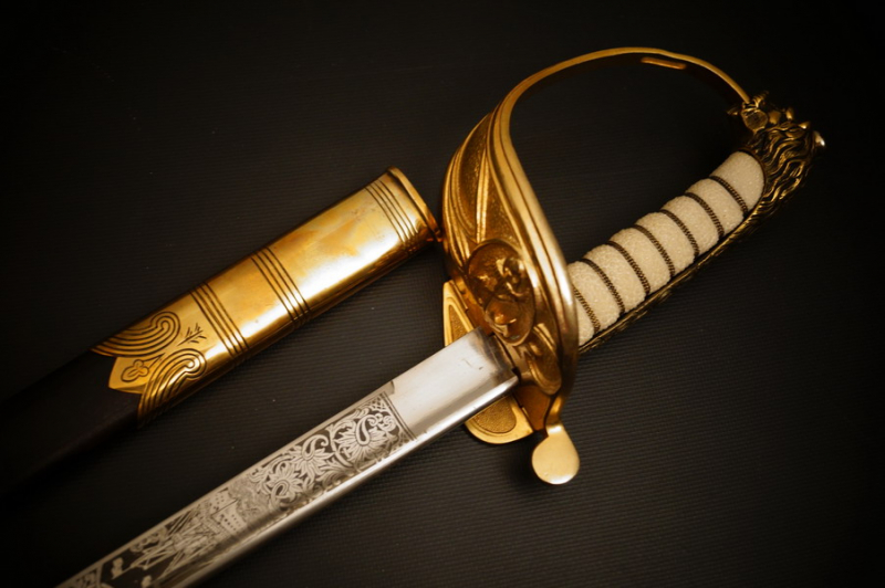 Fundzustand. Lederscheide mit den typischen alten Beschlagteilen. Teils mit perfekter Vergoldung. Klinge alt geschmiedet und mit alter beidseitiger Klingenätzung der Kaiserlichen Marine. Altes Stück aus Fundus. Deutsche alte Fertigung !