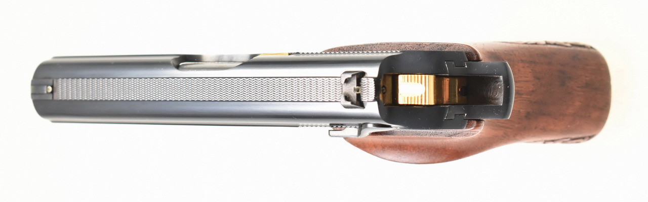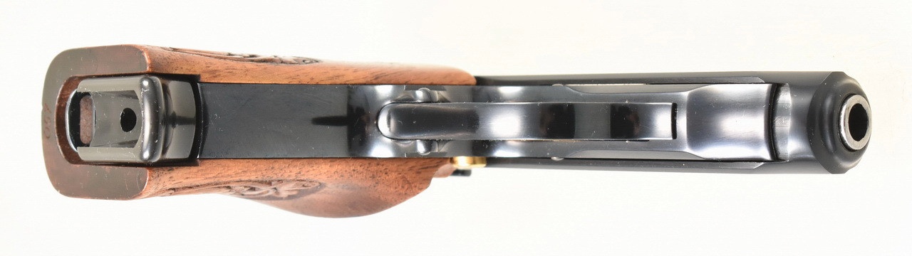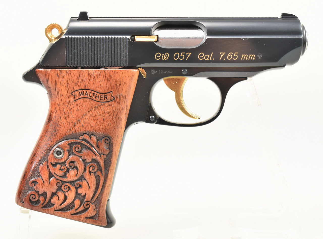 Leicht gebrauchte Double - Action Pistole des bekannten Waffenherstellers Carl Walther, Ulm. Spiegelblanker Lauf. Ulmer Beschuß 1981. Brünierter Verschluß mit Golgschriftzügen. Abzug, Hammer, Auszieher und Magazinknopf vergoldet. Holzgriffschalen mit Walther - Schleife und beidseitigen Verschneidungen. Die Lieferung erfolgt mit der beschnitzten, nummerngleichen Holzkassette und Reservemagazin. Details siehe Bilder.
