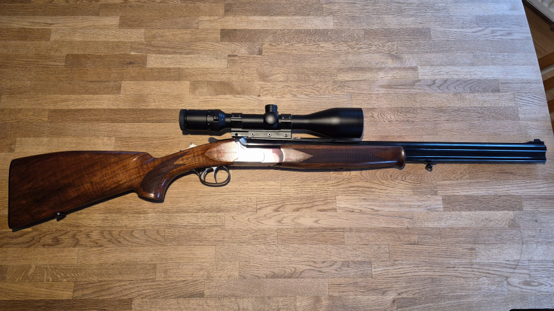 Das Abgebildete Zielfernrohr gehört nicht zur Auktion, es könnte optional erworben werden. Die Festmontage mit 30-er Ringen blaibt auf der Waffe