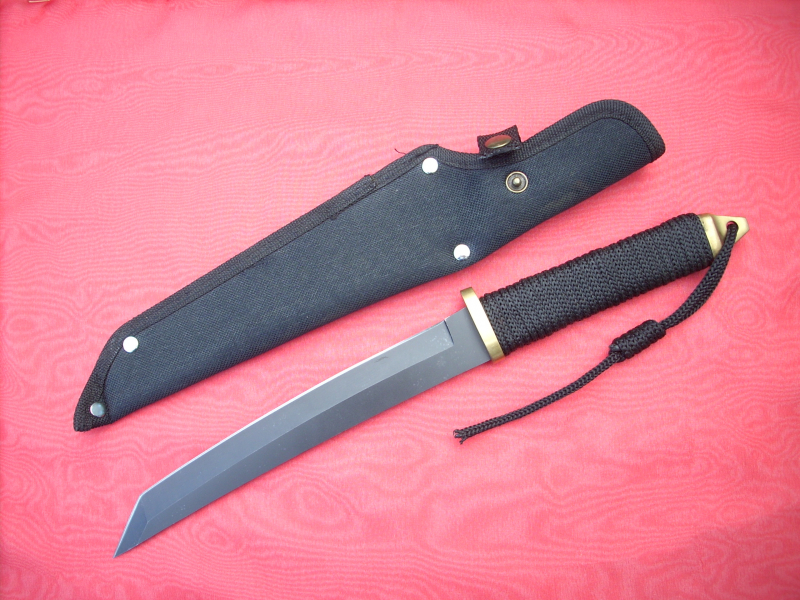 Kommandodolch – Kampfmesser / Survival in Textilscheide mit Trageschlaufe in Form eines japanischen Katanas. Knauf, Parier und Druckknopf aus Buntmetall. Macht am Gürtel schon etwas her. So gut wie neuwertiger Zustand siehe Fotos, die, wie immer, Bestandteil der Artikelbeschreibung sind. Keine Garantie und keine Rücknahme.