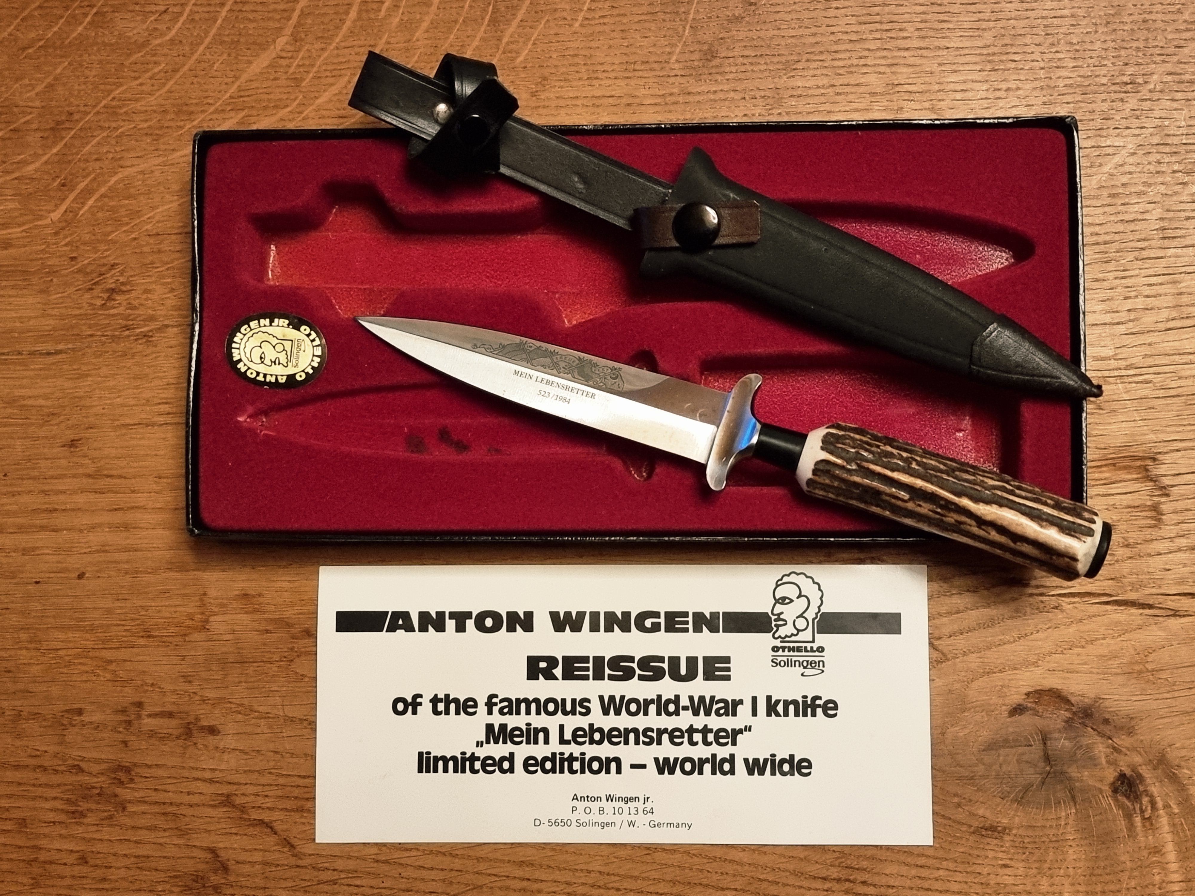 Verkauft wird ein Sammlermesser Modell "Mein Lebensretter" der Solinger Marke "Othello - Anton Wingen", welches sich am Design der deutschen Grabendolche des Ersten Weltkrieges orientiert.