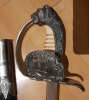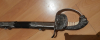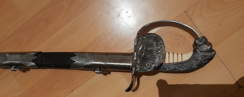 Löwenkopfsäbel mit Scheide.Scheide magnetisch mit belederung,diese etwas angestoßen und fleckig.Löwenkopf mit roten Augen.Klinge magnetisch,ohne Hersteller. Stichblatt klappbar.