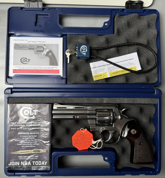 Biete meinen neuwertigen Colt Python 4 1/4" Zoll, stainless / Edelstahl, 6-schüssig, Kaliber .357 Magnum an. Der Revolver wurde von mir jagdlich nicht geführt, die Schussbelastung liegt unter 100 Schuss, Schussleistung top. Technische Ausstattung: einstellbare Visierung, aus Edelstahl, verstärkter Rahmen, Double- / Single-Action-Abzug, Walnussgriff mit Colt-Wappen, Lauf mit 6 Zügen, Gesamtlänge 247,65 mm.