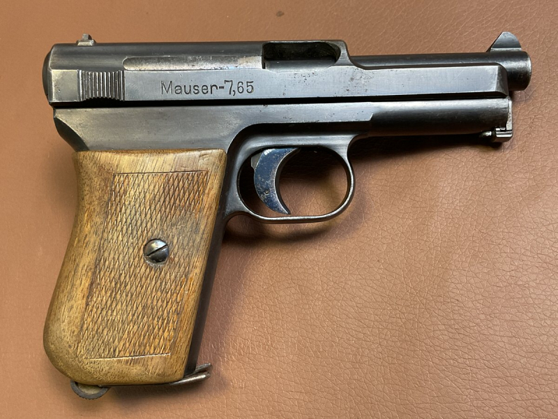 Pistole Mauser, Modell 1914 im Kaliber 7,65 Browning. Die Waffe befindet sich in einem guten Zustand. Das Griffstück ist nicht nummerngleich zur übrigen Waffe und trägt die Nummer 354673. Die Waffe ist mit der historischen Beschussmarke „Doppelkrone U“ versehen.