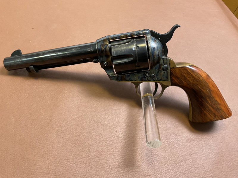 Es handelt sich um die ehemalige Fangschusswaffe eines Jägers. Der Revolver zeigt deutliche Trage- und Altersspuren an der linken Laufseite, befindet sich jedoch technisch in sehr gutem Zustand und wurde insgesamt wenig geschossen. Er verfügt über eine Lauflänge von 138 mm, eine 6‑Schuss‑Trommel und ein Single‑Action‑Abzugssystem. Besonders auffällig ist der sehr schön bunt gehärtete Rahmen. Die Waffe trägt italienische Beschussmarken, darunter den italienischen Nitro‑Beschuss „PSF“ mit Stern.