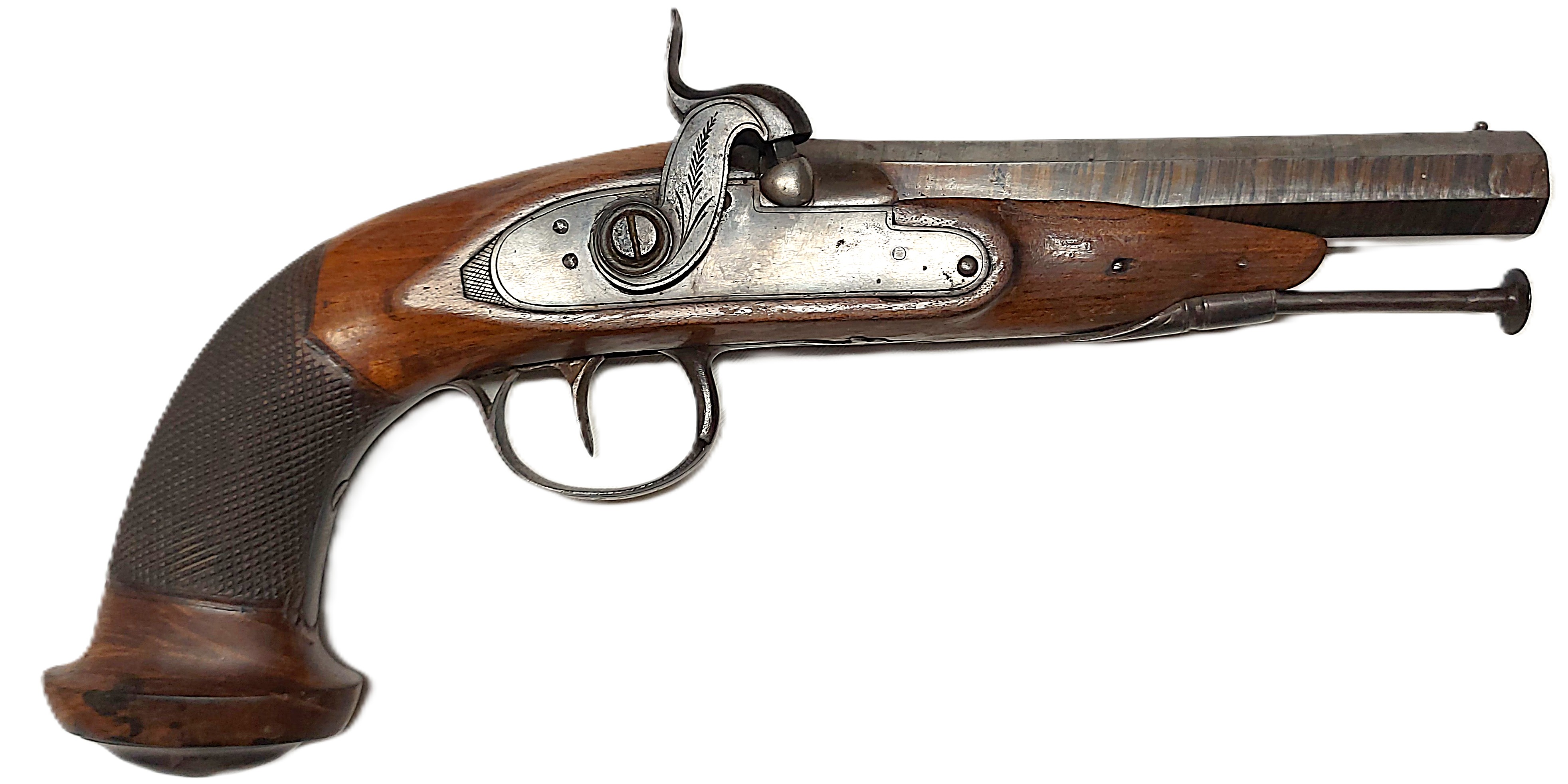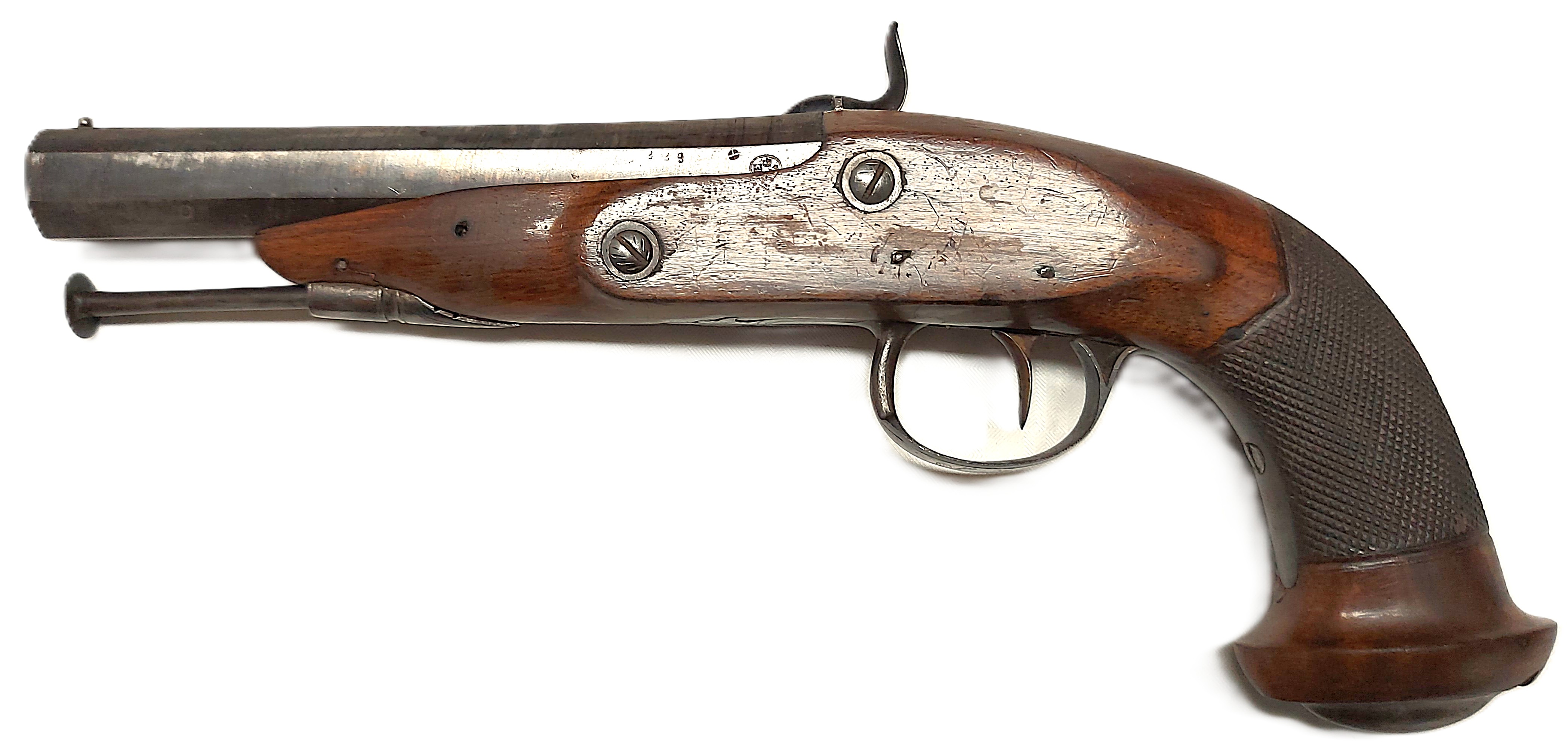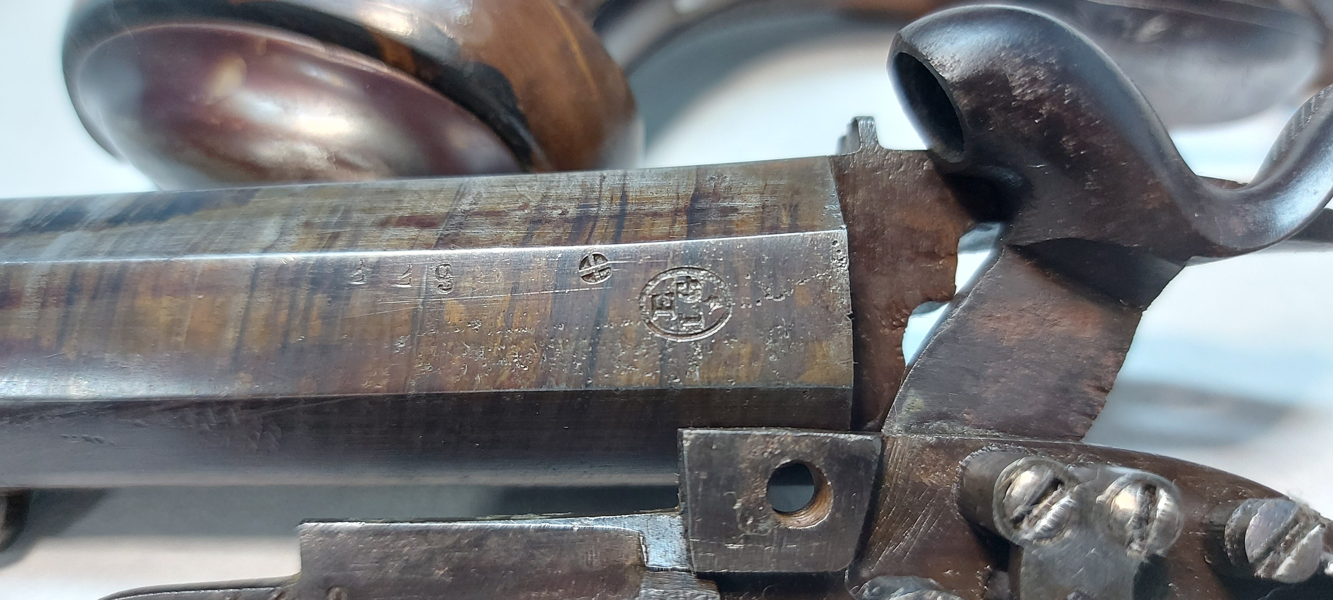 Sie bitten auf eine Perkussionspistole aus Belgien ein original um ca.1830, Hersteller HLW ? Beschuss ELG Lüttich (siehe Stempelung am Lauf) Waffennummer 229.