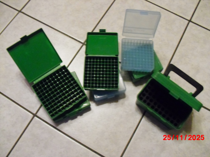 Hallo ich biete 7 Patronenboxen zur Auktion. 2x für .45 ACP a 100 St. 4x für .357mag. a 100 St. 1x für .308 ect. 50 St versicherter Versand Deutschland andere Länder bitte erfragen.Mfg
