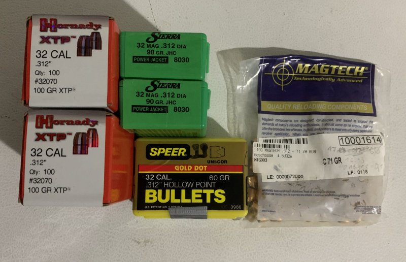 599 Stück KW-Geschoße Kaliber .32 / 312. 200 Stück Hornady XTP 100 Grain, 200 Stück Sierra JHC 90 Grain, 99 Stück Speer Gold Dot 60 Grain, 100 Stück Magtech VmRk 71 Grain.