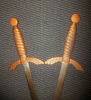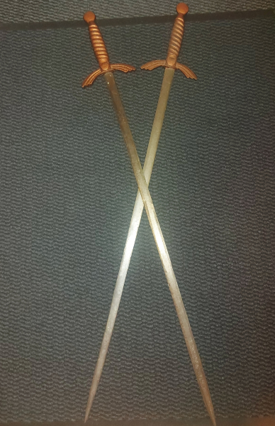 Dachbodenfund 2 Schwerter Länge ca 92 cm, Klinge 76 cm . Deko, alles nicht magnetisch, die Klingen haben Gebrauchsspuren und sehen nicht gerade schön aus. Ich hoffe auf den Fotos ist der Zustand zu sehen. Vielleicht kann man sie ja aufarbeiten und noch eine schöne Wanddekoration daraus machen. In anderen Auktionen biete ich noch ein Paar Säbel und Dolche in der selben Machart bzw. Zustand an. Sammeln und gemeinsamer Versand möglich.