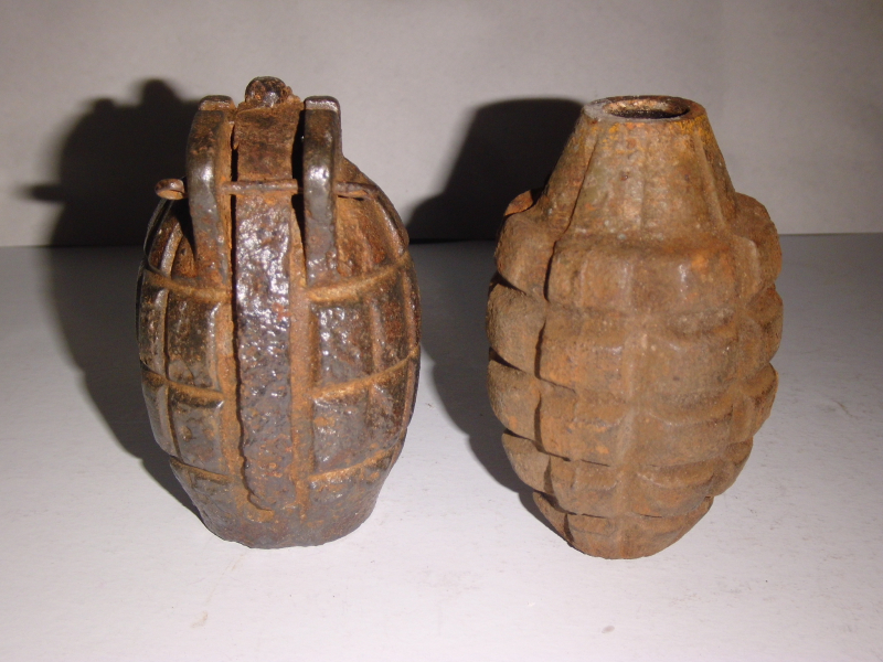 Hier biete ich 2 Handgranatenkörper zum Verkauf an. Die Linke auf dem Bild ist mir Unbekannt, die Rechte ist eine US Annanas. Beide Hgr Körper sind leer und frei von gefährlichen Stoffen.