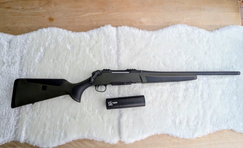 Zum Verkauf steht ein Geradezug-Repetierer Hänel Jäger NXT Composite Kaliber .308 mit einem passenden Schalldämpfer „Stille im Wald“ OBSK Ultra. Lauflänge 52 cm. Die Waffe wiegt ca. 3120 g bei einer Länge von ca. 104 cm, mit dem aufgeschraubten Schalldämpfer ca. 114,5 cm. Der Schalldämpfer wiegt ca. 366 g. Das herausnehmbare Magazin fasst 5 Patronen und kann in der Waffe gegen versehentliches Entfernen gesichert werden. Die Picatinny-Schiene ermöglicht eine robuste, kostengünstige und problemlose ZF-Montage. Höhenverstellbare Schaftbacke.