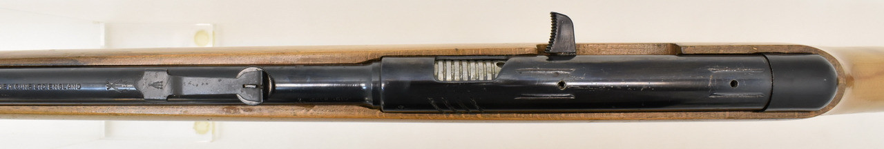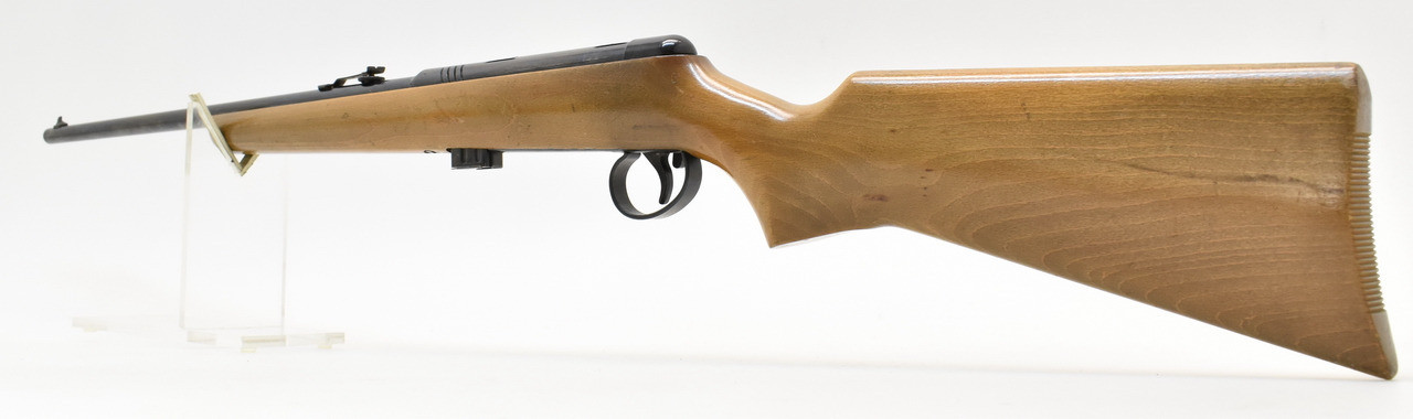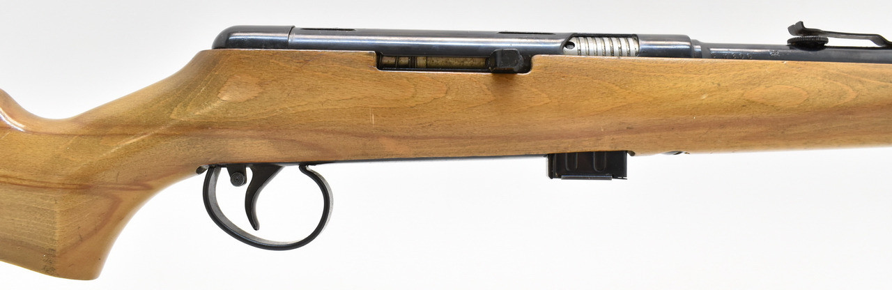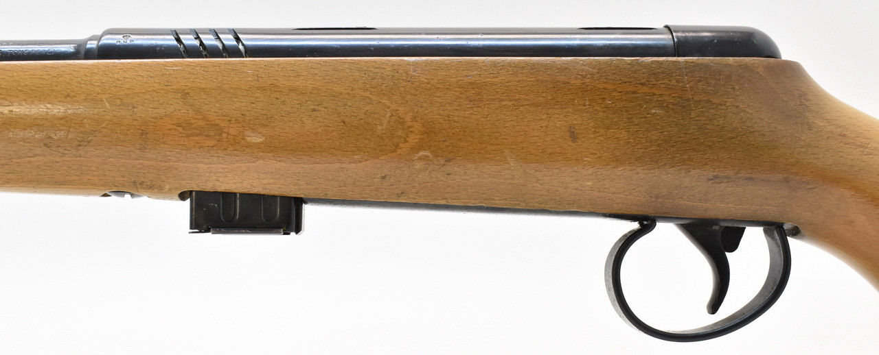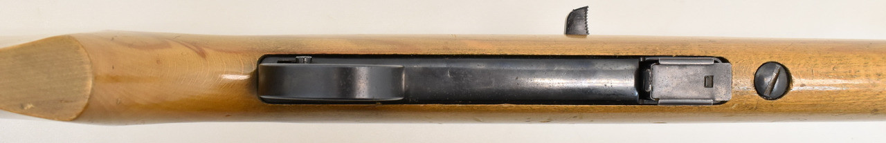 Handlicher Selbstlader mit 5-Schuss Magazin und Druckpunktabzug. Schaftlänge gemessen von vorderen Abzug bis Mitte Schaftkappe 36cm. Die Waffe hat deutliche, dem Alter entsprechende Gebrauchsspuren.