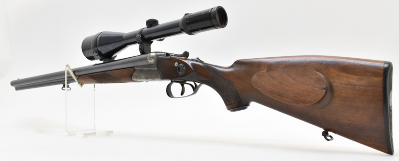 Stahlsystemkasten mit kleiner Gravur, französischer Rückstecher im vorderen Abzug. Läufe aus Special Gewehrlaufstahl, alle Läufe sind blank. Die Brünierung zeigt partiell kleine Rostnärbchen. Die Waffe ist mittels einer Schwenkmontage mit einem Kahles ZF Helia S 3-12x56 Abs. 1 montiert. Der Verschluss ist stramm, Beschuss von 12/1986 Schaftlänge 36,5cm gemessen vom vorderen Abzug bis Mitte Schaftkappe.