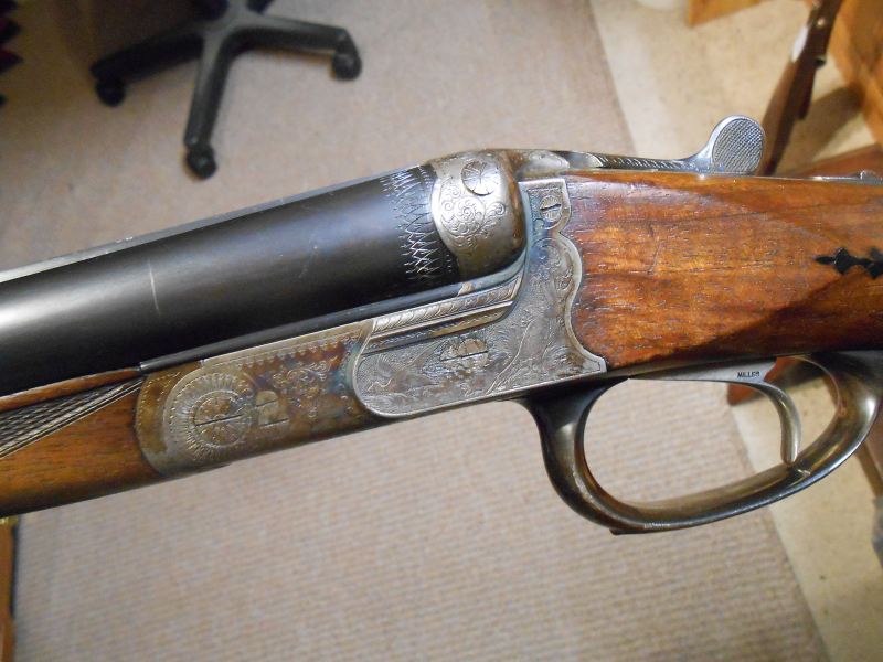 Doppelflinte kal 16/70 Beschuss 10/23. Extrem seltene Variante mit Einabzug, mechanische Umschaltung und Ejektor. Keine Herstellerangaben, nur Abzug mit "Miller" beschriftet. Läufe sind blank. Kompletter Systemkasten mit sehr guter Gravur, buntgehärtet. Schaftlänge 365mm. Hornabzugbügel mit Verlängerung.