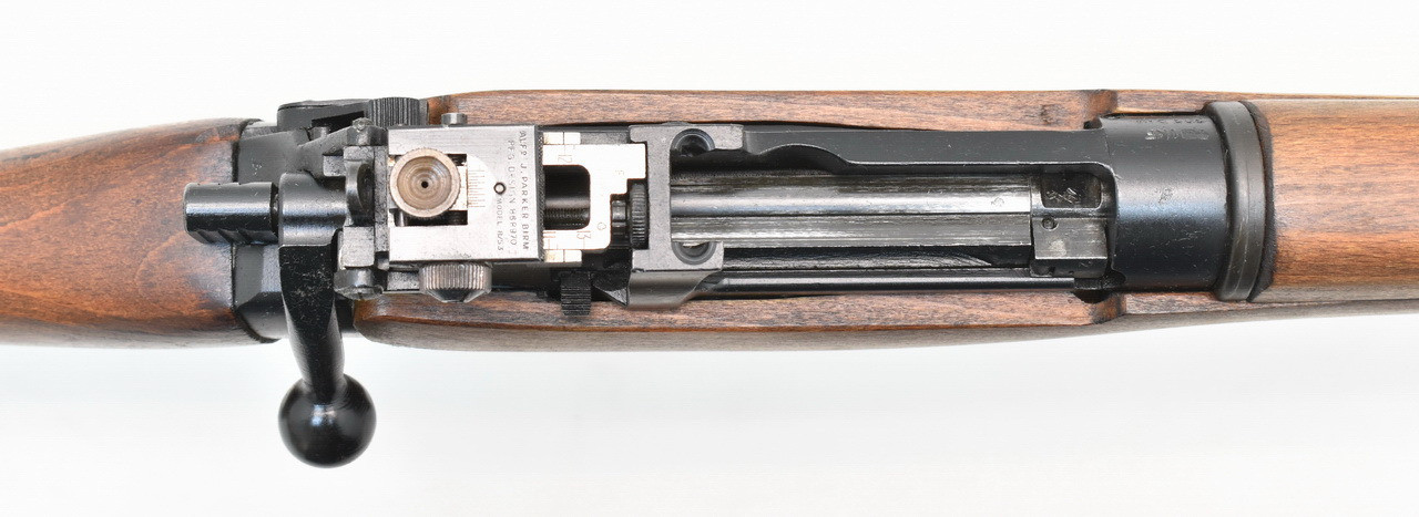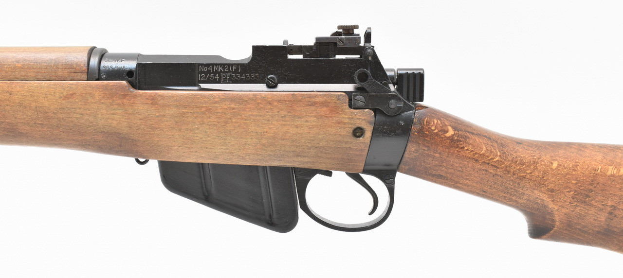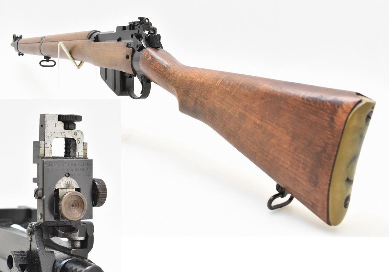 Nummerngleiches englisches Lee - Enfield Militärgewehr No.4 Mark 2 aus Nachkriegsfertigung der ROF(F) Royal Ordnance Factory Fazakerly des Jahres 1954. Höhenverstellbare Mk I Visierung mit seitenverstellbarem Parker Hale Modell 8/53 Dioptereinsatz. Spiegelblanker, fünfzügiger Enfield - Lauf. Mellrichstädter Beschuß 1995. Frankonia Vertriebsstempel. 325mm lange Schäftung für Rechts- und Linksschützen ( Schaftlänge gemessen vom Abzug bis Mitte Schaftkappe ). Mit nur leichten Gebrauchsspuren. Details siehe Bilder.