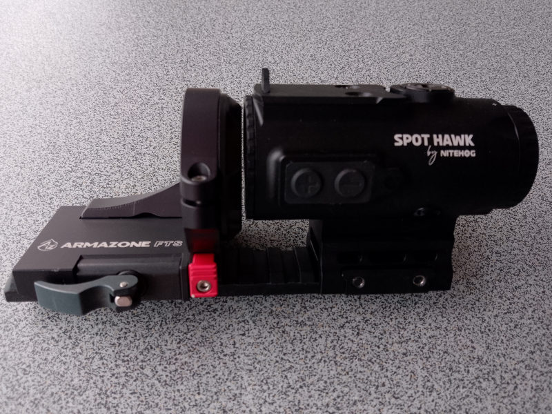 Nitehog Spot Hawk 4x24 Prism Scope mit Armazone Flip to Side Adapter.