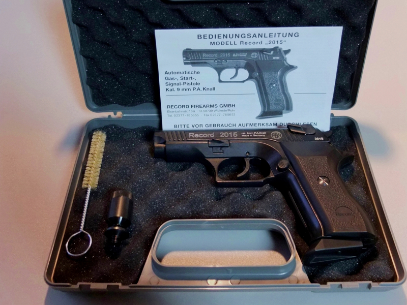 Pistole für Cal. 9mm PAK-Platzpatronen – Gaspatronen - Pfefferpatronen. Zustand: unbenutzt, wie neu - Zustand siehe auch Fotos. Mit original Hartschalenbox, Abschussbecher für Signalmunition, Reinigungsbürste, und Bedienungsanleitung.