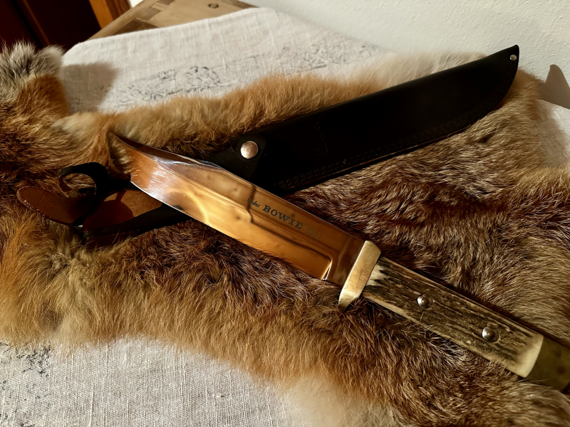 Zum Verkauf steht ein großes Linder Bowie Messer (Dachbodenfund) mit aufwendiger Gravur auf der Klinge, Hirschhorngriff, einer Klingenlänge von 25cm und einer Gesamtlänge von 39cm inkl. der abgebildeten Scheide.