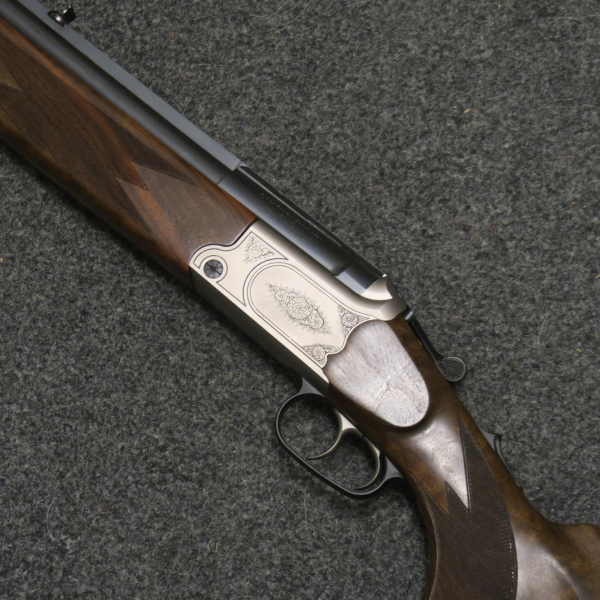 Angeboten wird ein Bockbüchsflinte Merkel Mod. SL III Kal. 8x57IRS / 12/76. Schaftlänge 36,5cm, Lauflänge 60cm. Handspannung und Feinabzüge. Beschuss 1999