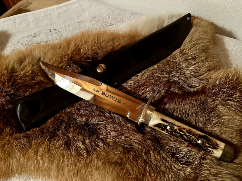 Zum Verkauf steht ein Linder Bowie Messer (Dachbodenfund) mit Hirschhorngriff, einer Klingenlänge von 20cm und einer Gesamtlänge von 32cm inkl. der abgebildeten Scheide.