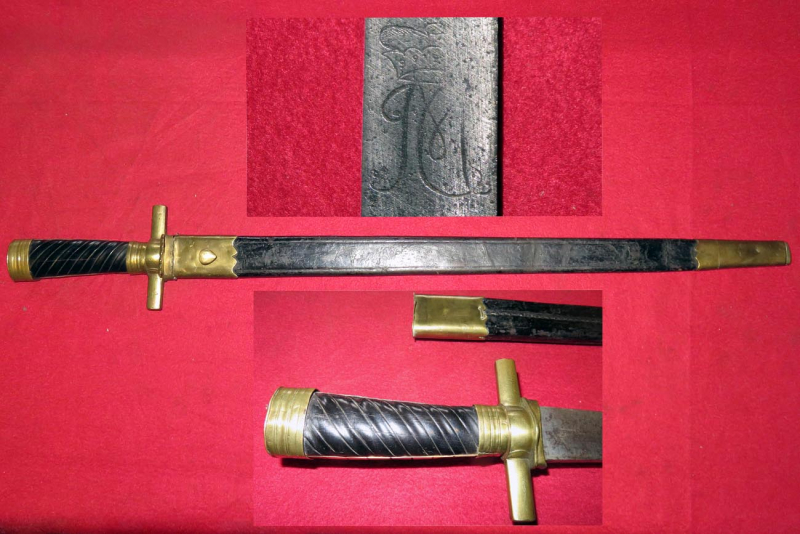 Der in allen Teilen originale Hirschfänger hat auf der Klinge Initialen mit fürstlicher Krone, die ich jedoch nicht klar deuten kann.
