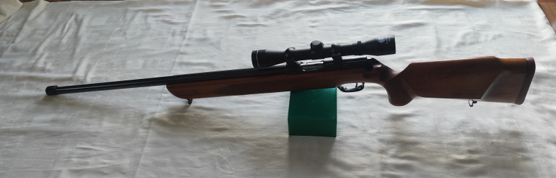 Der Einzellader hat Kaliber .22lr und einen schweren Matchlauf. Ebenso eine Holz-Match-Schaft.