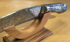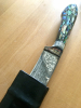 Wunderschöner Damast, und eine einseitig angeschärfte spitze Klinge. Eine schwarze mit Leder bezogene Holzscheide gehört dazu. Der Messerständer ist NICHT Teil dieser Auktion.