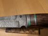 Diese Klinge hat eine wunderschöne Damaststruktur , auch die Zwinge ist aus Damast, einen Edelholzgriff mit verschiedenfarbigen Zwischenlagen in Neusilber, grünem und rotem Fiberglass-