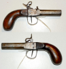 Perkussionspistole, fester Lauf, Lauflänge 6,4 cm, Gesamtlänge 17,3 cm, Kaliber 11,5 mm, technisch guter Zustand, braune Patina, am Holzgriff vorn rechts kleiner Riss, der jedoch keine Beeinträchtigung darstellt