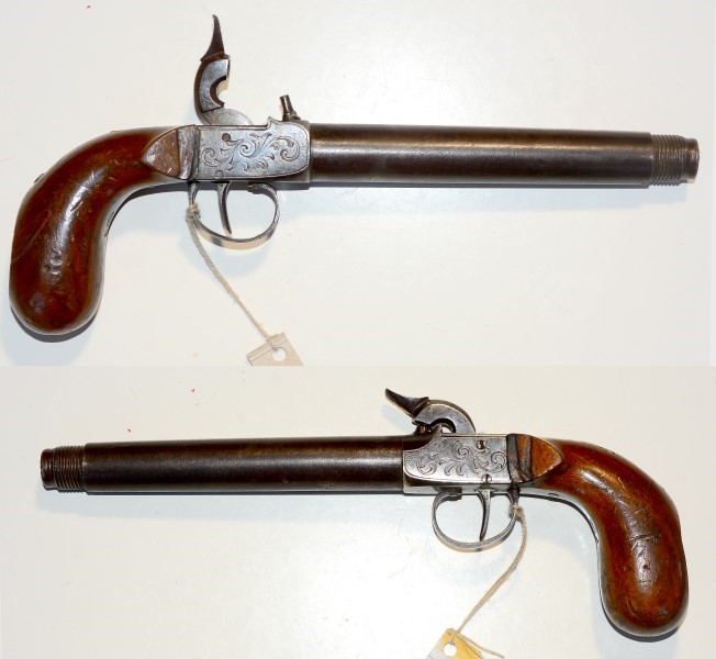 Französische Wildererpistole, Perkussion, durch Anschrauben eine Laufverlängerung und Anstecken eines Kolbens kann sie zu einem leichten Gewehr umgebaut werden, Kolben und Laufverlängerung sind nicht vorhanden, Lauf mit Rosendamastprägung, gute Funktion und ohne Mängel, Lauflänge 15,8 cm, Gesamtlänge 28,2 cm, Kaliber 15mm