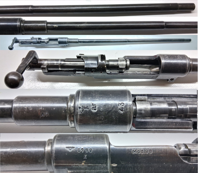 Angeboten ist eine Repetierbüchse (nur wesentliche Waffenteile), Mauser 98k Wehrmacht, gebogener Kammerstängel mit Kugelkopf. Es wird das abgebildete System, Verschlussträger und der Lauf angeboten.