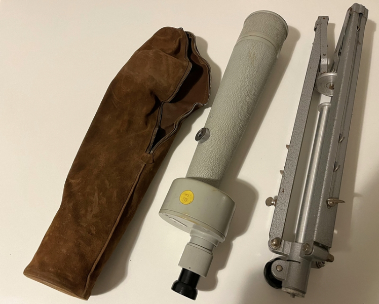 das gezeigte Asiola Spektiv, die originale Ledertasche und das originale 16-O Okular.