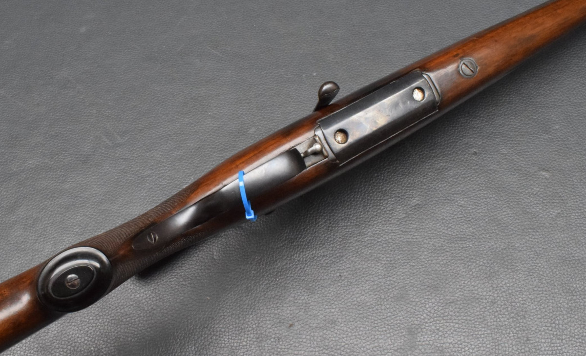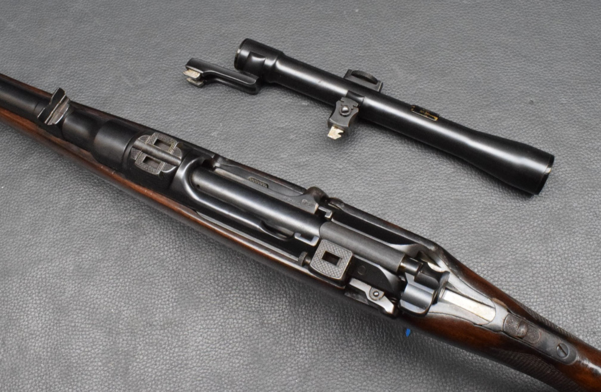 Lauf mit Klapp Visierung, Zylinderverschluß mit Flügelsicherung, deutscher Stecher kann über einen kleinen Hebel gewechselt werden,