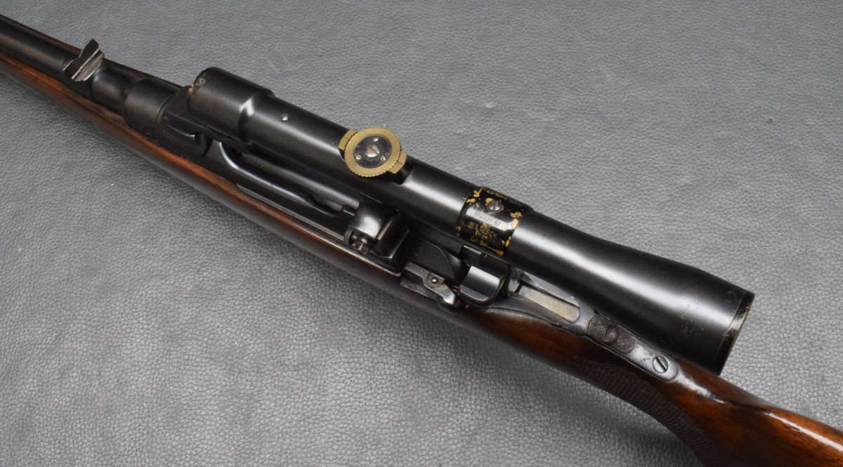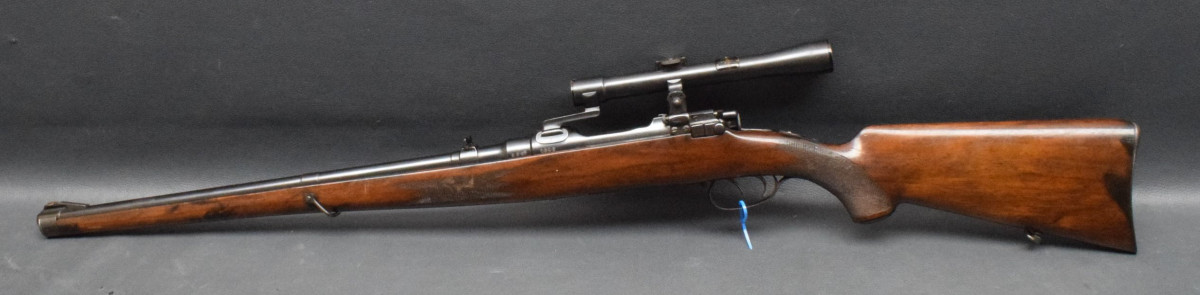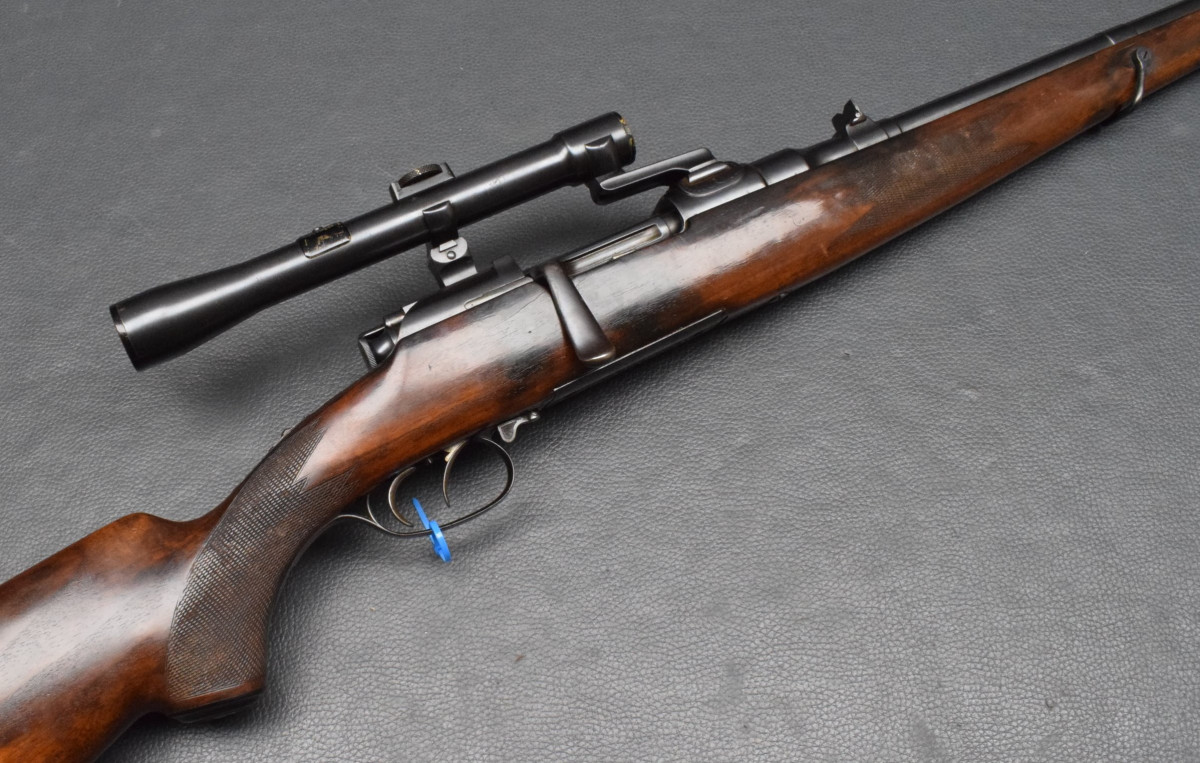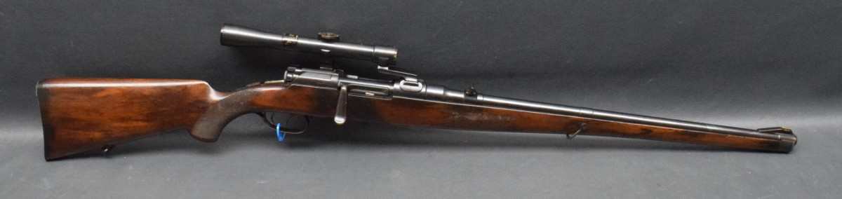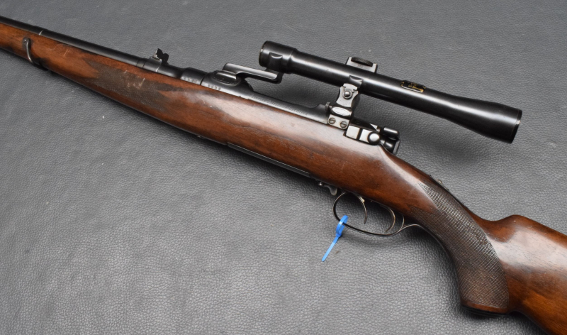 Montiert mit Zielfernrohr Kahles Mignon 4x25 Abs. ?, mittels 3-Fuß SEM Montage. Nußbaumschaft ohne Backe, Stahlschaftkappe mit Magazinfach für 3 Patronen und Riemenbügeln Lauf gut, Brünierung 92%, Schaft gut Gebrauchtwaffe, gut