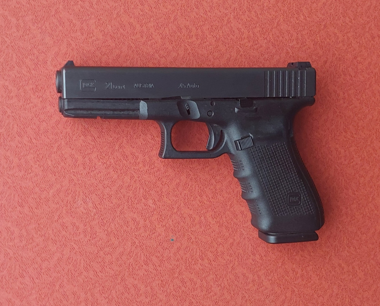 Pistole von Hersteller "Glock", Mod. 21 - Gen 4 / Kal.: .45 Auto / Lauflänge ist 115mm / sehr guter Zustand, nur wenig oberflächige Spuren / die Züge im Lauf sind blank und scharf /