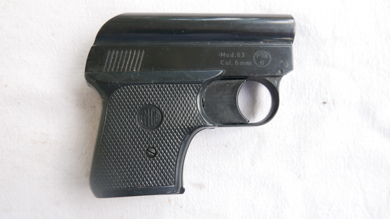 Beschriftung rechts: Mod. 63, Cal. 6mm und PTB 6 im Kreis, Griffschale Logo EM.GE