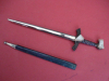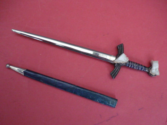 Fliegerschwert als Brieföffner aus der Zeit. Gesamtlange ca. 18cm. Mit Lederscheide. Klingenbeschriftung : C. F. Stettes , Solingen. Mit Hoheitszeichen.