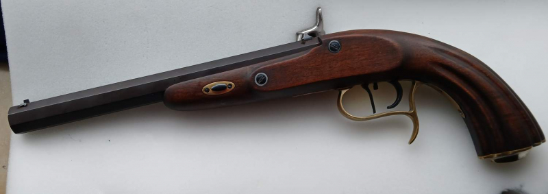 Biete eine Perkussion Vorderlader Pistole Model Le Page ou Paris, hergestellt bei Pablo Bondini in Italien in den 80-er Jahren. Der Schaft ist aus Nussbaum, (nicht Nuss farbig gebeizt) und geölt, nicht lackiert. Diese Pistole hat einen Bondini Präzisionslauf, außen matt Bräuniert, nicht Brüniert,kal.45" hat 12 Züge und ,unübliche für VL Pistolen, Dralllänge ca.47cm. Ein Putzstock macht genau eine halbe Umdrehung auf der Lauflänge, und ist rostfrei. Abzug und Vorspannung funktionieren einwandfrei. Holz ist ohne kleinsten Kratzer, Risse oÄ.Diese Pistole ist seit ca. 30 Jahren bei mir und wurde von mir nie geschossen, ob der Vorbesitzer damit geschossen hat ? schon möglich. EU Versand für 20€ möglich.Bitte Ihren Altersnachweis nicht vergessen, außer ID Egun-er.