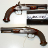Italienische Offizierspistole, wahrscheinlich von Steinshloss aptiert, auf dem Lauf noch schwach in Goldschrift erkennbar "Cason", Lauflänge 16,3, Lauf aushakbar, Gesamtlänge 30,8 cm, Kaliber 15mm, die Gravur am Hahn ist nicht original, Kolben unten mit Metallkappe, original Ladestock, guter Zustand mit Gebrauchsspuren